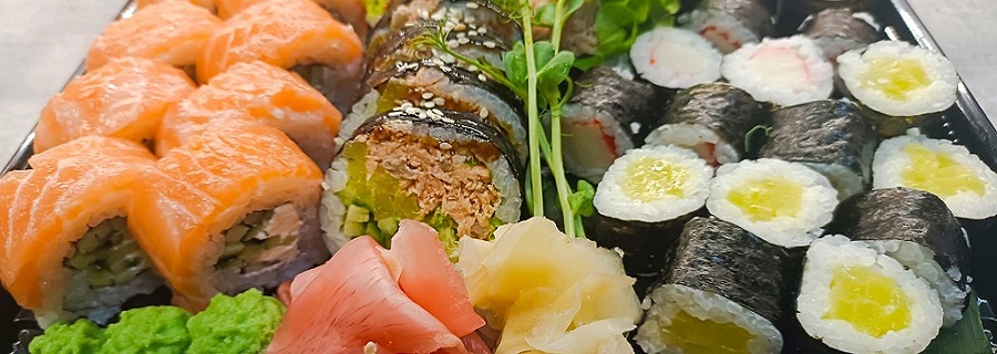 Ryż w kształcie onigiri, kawałki łososia upieczone w bardzo chrupiącej panierce panko, plasterki ogórka lub pomidorki