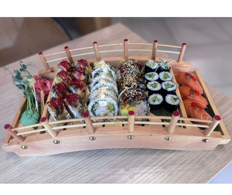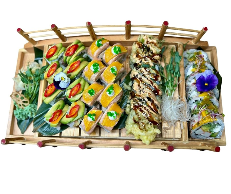8szt- California Rainbow(crab tempura, serek, awokado, oshinko, ogórek, tuńczyk, łosoś, awokado, mango, majonez homarowy, kizami wasabi, tobiko, masage arare) # 6szt- Uramak węgorz unagi owinięty w omlet (węgorz w tempurze, serek, kanpyo, grzyby shitake, omlet tamago) # 6szt– Futomak karmazyn baby pepperoni (karmazyn w tempurze, serek, sałata, oshinko, ogórek, majonez japoński, baby pepperoni) #8szt - Hosomak chrupiące mango plum